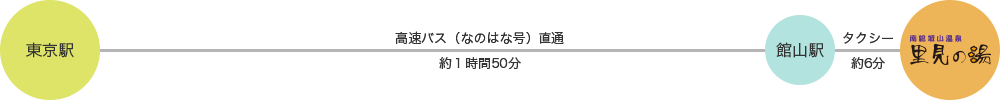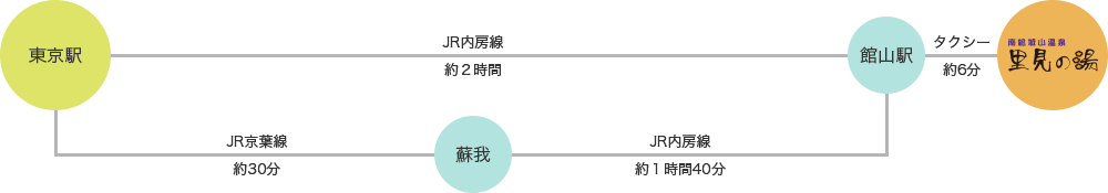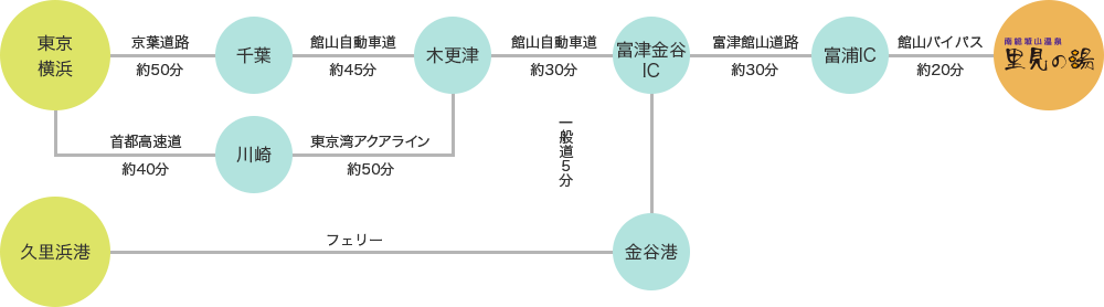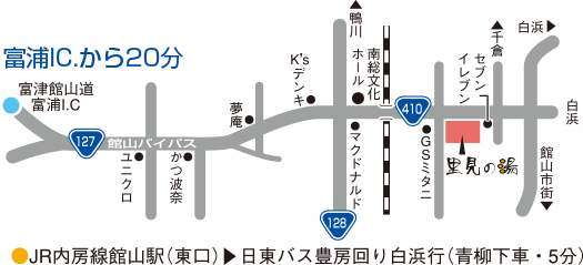 富津館山自動車道:富浦ICより、館山バイパスを館山方面へ車で約20分。 ※200台収容の無料駐車場がございます。